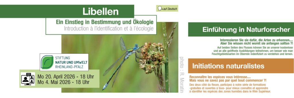 In diesem zweiteiligen Webinar bekommt ihr eine ausführliche Einführung in die Welt der Libellen. Beim ersten Termin geht es um den Aufbau der bunten Fluginsekten, die Grundlagen der Bestimmung und erste Arten. Anschließend lernen wir noch mehr über die Lebensweise der Libellen und weitere Arten kennen. Nach dem Webinar seid ihr in der Lage, an Fluss und Teich selbst erste Libellen zu bestimmen.